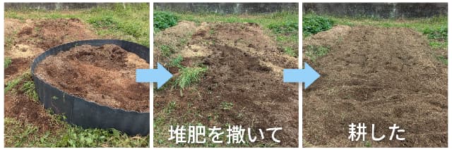 今回は、半年ほど寝かせた 廃菌床ともみ殻の堆肥 を投入!