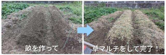今回は廃菌床ともみ殻の堆肥を撒いてから土と混ぜて畝づくりをしましたよ!