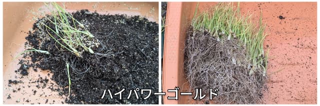 黒い育苗箱では、ハイパワーゴールド、緑の育苗ポットでは泉州中甲高黄を育てていました。