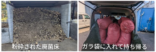 最近は四角いブロックではなく、粉砕された乾燥タイプの廃菌床を頂くことが多く、ガラ袋にたっぷり入れて運んでいます。
