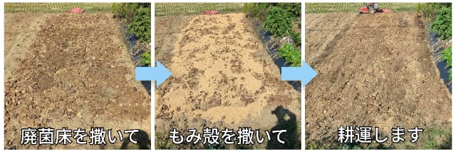 廃菌床や籾殻を撒き、耕運機で混ぜ、・・・