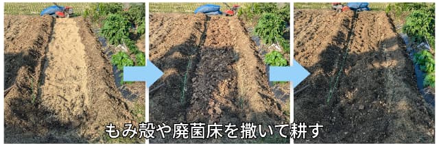 さらに籾殻と廃菌床を撒いてさらに耕します。これは畝を高くするため深くまで耕して土をあげて高さを稼ぐためです。