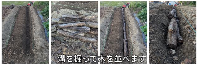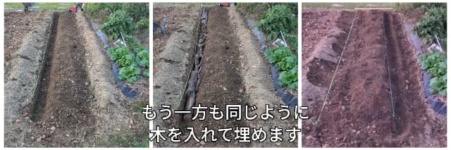 深く耕して土を持ち上げ、木を両端に埋めているのは、菌は空気がある場所でよく働くので、畝の両端に木を入れるのがポイントなんです。