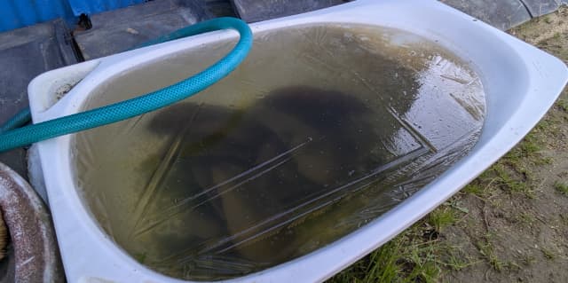 雨水をためているベビーバスには、しっかりと氷が張っていました。
