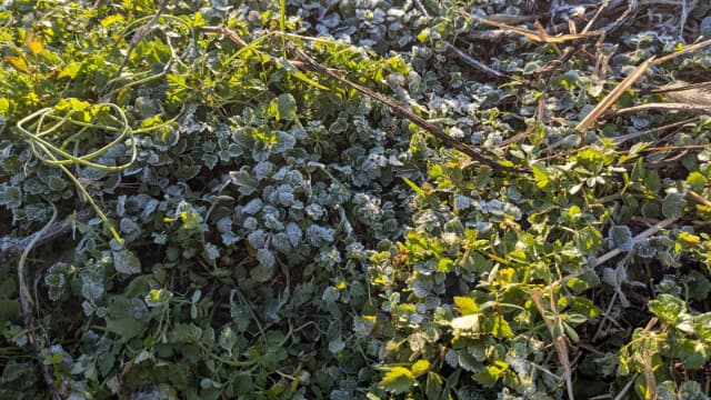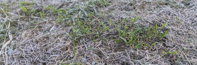 雑草も霜に耐えながら、少しずつ成長中。