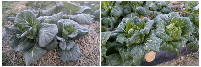 朝の畑は一面真っ白。霜に覆われたキャベツと白菜は、見ているだけで寒さが伝わってきます。