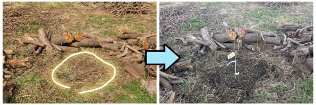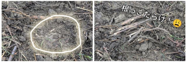 そのほかにも雑木の切り株やススキの根っこがあるので、思ったところに苗を植えることができません。