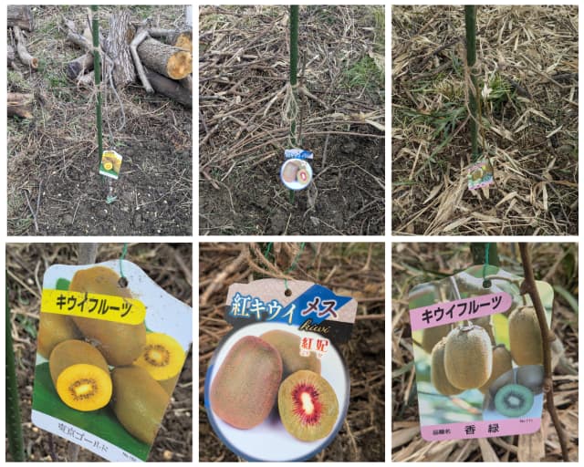 キウイは雌木だけでは実がならないので、授粉用の雄木の苗も一緒に植えています。