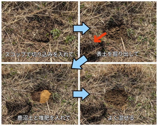 植えられるところに穴を掘って定植。定植した場所には表土の土を敷きます。